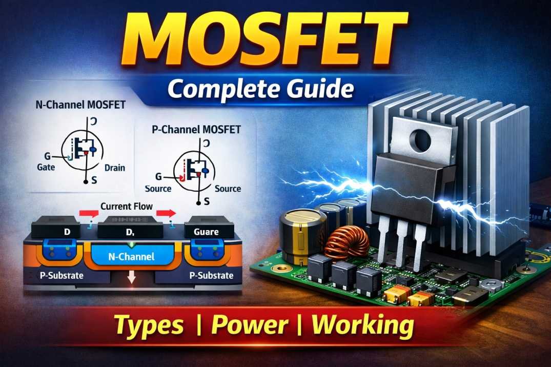 🔥 MOSFET क्या है? MOSFET (Metal-Oxide-Semiconductor Field-Effect Transistor) एक semiconductor device है जिसका उपयोग electronic circuits में switching और amplification